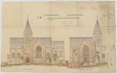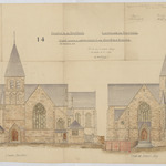 Opschrift: Province de Brabant. Commune de Beersel. Plan pour la construction d'une nouvelle église. Omschrijving plan: opstand voorgevel, opstand gevel zuid-west Datum KCML: 28/02/1914 Archiefnummer: B0066