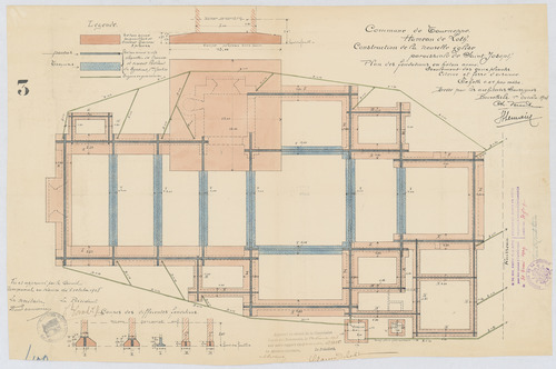 Opschrift: Commune de Tourneppe. Hameau de Loth. Construction de la nouvelle église paroissiale de Saint Joseph. Omschrijving plan: plattegrond niveau -1 Datum KCML: 14/11/1908 Archiefnummer: B0097
