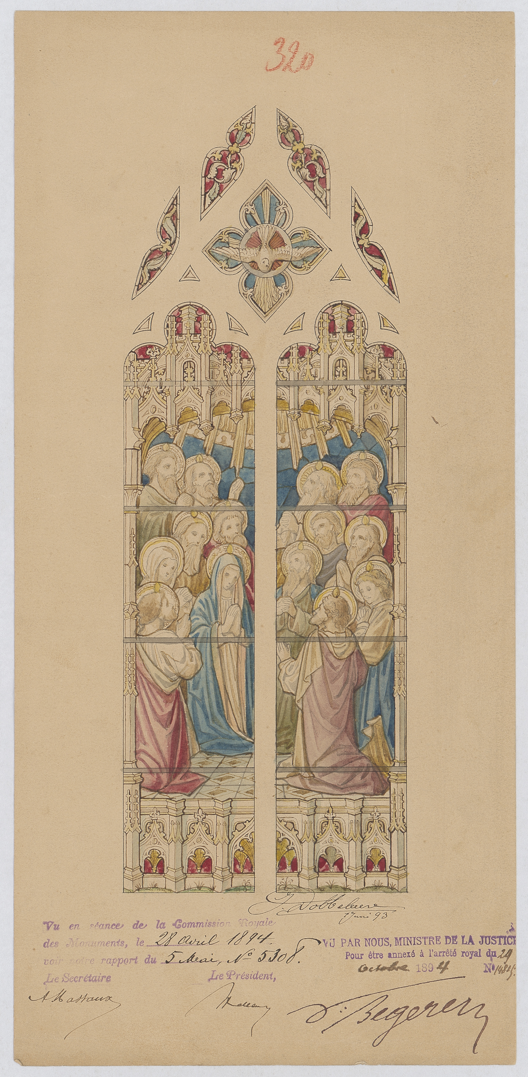 Opschrift: deze informatie wordt niet vermeld op het archiefstuk Omschrijving plan: glasraam Datum KCML: 28/04/1894 Archiefnummer: B0084