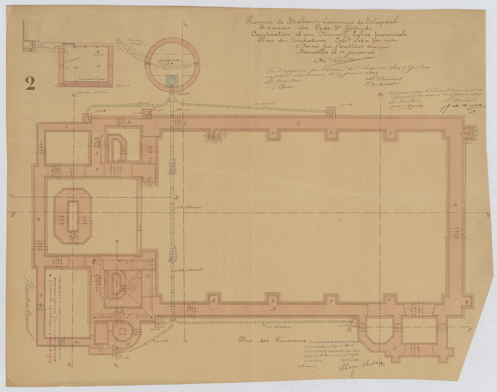 Opschrift: Province de Brabant - Commune de Schepdael. Hameau de Pede-Ste-Gertrude. Construction d'une nouvelle Eglise paroissiale. Plan des fondations. Omschrijving plan: plattegrond niveau -1 Datum KCML: 7-4-1906 Archiefnummer: B0197