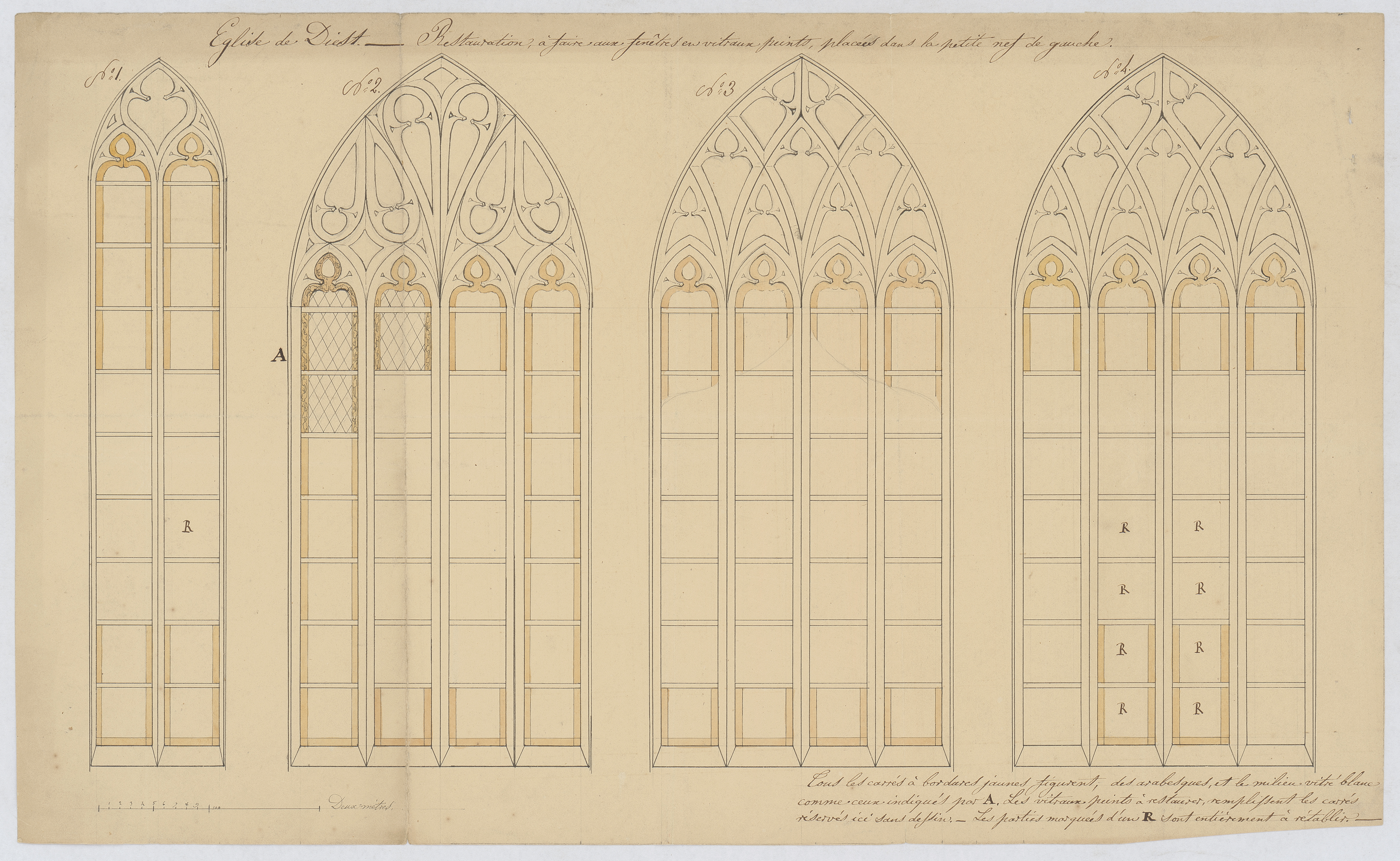 Opschrift: Eglise de Diest. Restauration à faire aux fenêtres en vitraux prints, placeés dans la petite nef de gauche. Omschrijving plan: aanzicht kerkramen Datum KCML: deze informatie wordt niet vermeld op het archiefstuk Archiefnummer: B0145