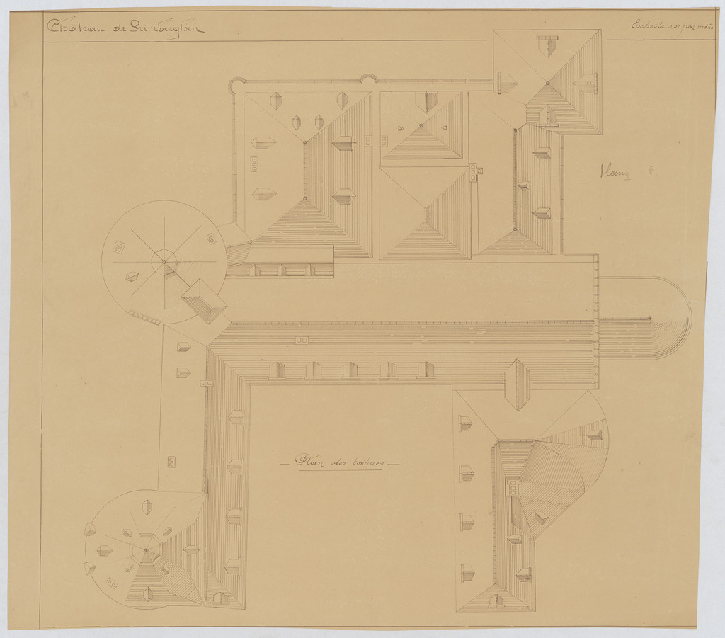 Opschrift: Chateau de Grimberghen. Omschrijving plan: plattegrond niveau 2, dakenplan Datum KCML: deze informatie wordt niet vermeld op het archiefstuk Archiefnummer: B0264