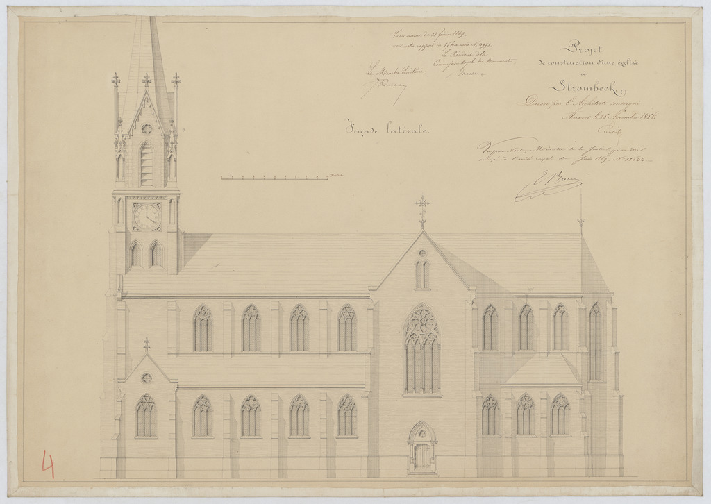 Opschrift: Projet de construction d'une église à Strombeek. Omschrijving plan: opstand zijgevel 1 Datum KCML: 13/02/1869 Archiefnummer: B0272