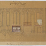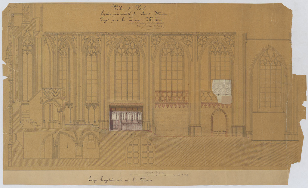 Opschrift: Ville de Hal. Eglise paroissiale de Saint Martin. Projet pour le nouveau Mobilier. Omschrijving plan: dwarsdoorsnede, dwarsdoorsnede over het koor met plaatsing meubilair (aangepast ontwerp) Datum KCML: deze informatie wordt niet vermeld op het archiefstuk Archiefnummer: B0299_01