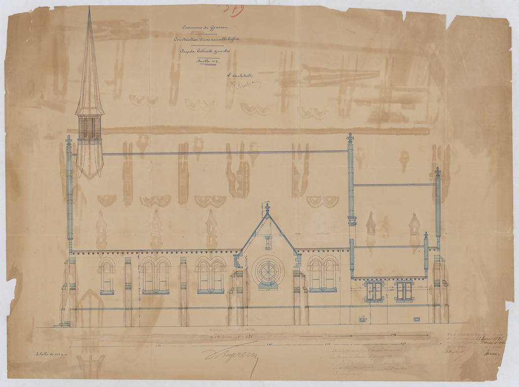 Opschrift: Commune de Graesen. Construction d'une nouvelle Eglise. Façade latérale gauche. Omschrijving plan: opstand zijgevel 1 Datum KCML: 27/02/1897 Archiefnummer: B0230