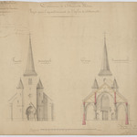 Opschrift: Commune d'Attenrode-Wever. Projet pour l'agrandissement de l'église de Attenrode. Omschrijving plan: opstand voorgevel, dwarsdoorsnede naar portaal Datum KCML: 20/08/1876 Archiefnummer: B0247 Ontwerper: Van Arenbergh, voornaam onbekend