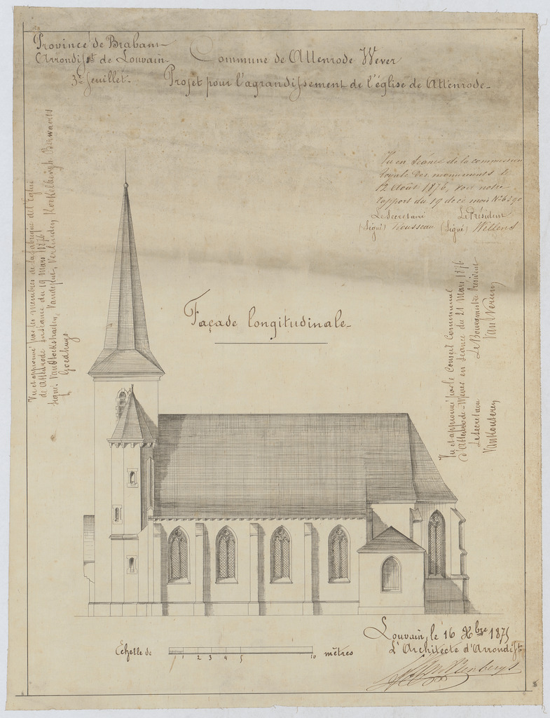 Opschrift: Commune d'Attenrode-Wever. Projet pour l'agrandissement de l'église de Attenrode. Omschrijving plan: opstand zijgevel 1 Datum KCML: 20/08/1876 Archiefnummer: B0245 Ontwerper: Van Arenbergh, voornaam onbekend
