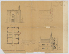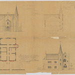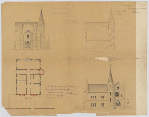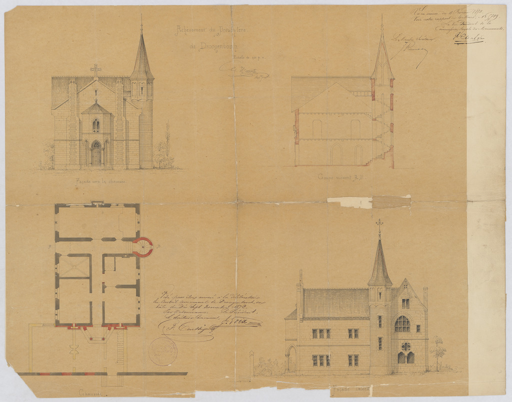 Opschrift: Achèvement du Presbytere de Droogenbosch. Omschrijving plan: plattegrond niveau 0, opstand voorgevel, opstand zijgevel, doorsnede Datum KCML: 11/02/1873 Archiefnummer: B0210