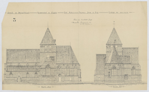 Opschrift: Commune de Droogenbosch. Restauration de l'Eglise. Etat actuel. Façade Sud & Est. Omschrijving plan: opstand O-gevel, opstand Z-gevel Datum KCML: deze informatie wordt niet vermeld op het archiefstuk Archiefnummer: B0207