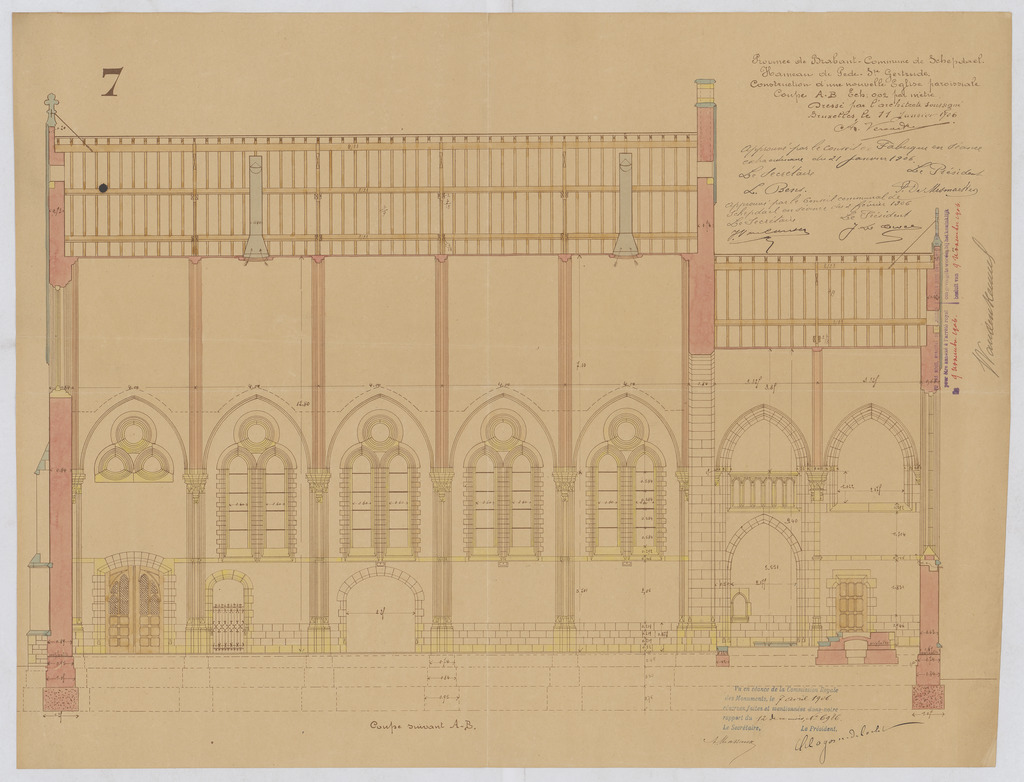 Opschrift: Province de Brabant - Commune de Schepdael. Hameau de Pede-Ste-Gertrude. Construction d'une nouvelle Eglise paroissiale. Coupe A-B. Omschrijving plan: langsdoorsnede Datum KCML: 7-4-1906 Archiefnummer: B0202