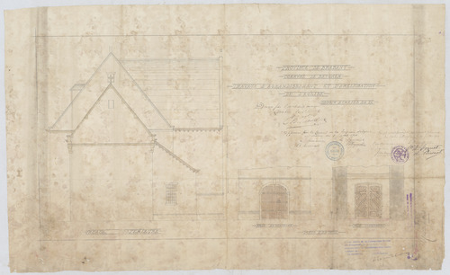 Opschrift: Province de Brabant. Commune de Beyghem. Travaux d'agrandissement et d'améliorationde l'église. Omschrijving plan: opstand achtergevel, detail deur langs binnen- en buitenzijde Datum KCML: 3-9-1911 Archiefnummer: B0267