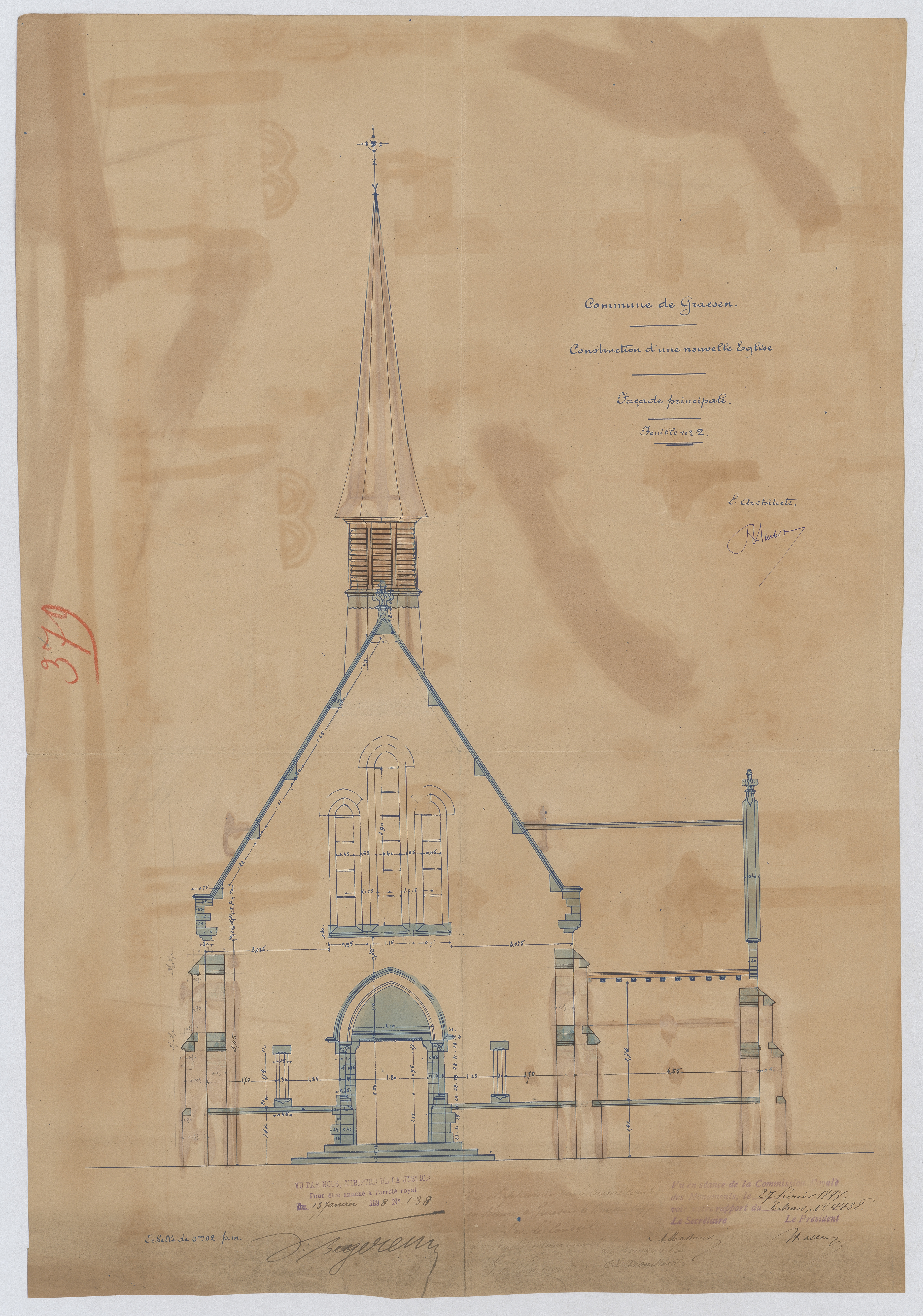 Opschrift: Commune de Graesen. Construction d'une nouvelle église. Façade principale. Omschrijving plan: opstand voorgevel Datum KCML: 27/02/1897 Archiefnummer: B0229