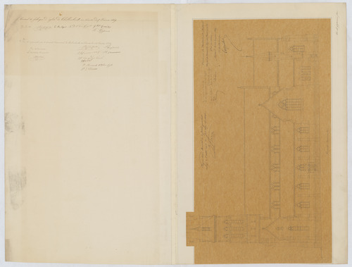 Opschrift: Commune de Thollembeek-Brabant. Projet de nouvelle Eglise Paroissiale. Omschrijving plan: opstand zijgevel 1, langsdoorsnede (voorzijde) Datum KCML: 10/04/1869 Archiefnummer: B0222_a