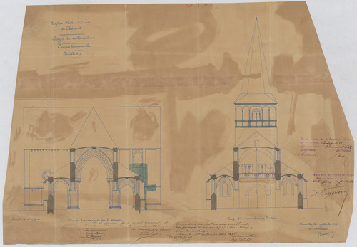 Opschrift: Eglise Notre Dame de Hérent. Projet de restauration. Omschrijving plan: dwarsdoorsnede, dwarsdoorsnede naar portaal, dwarsdoorsnede naar koor Datum KCML: 02/05/1896 Archiefnummer: B0368
