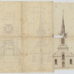 Opschrift: Agrandissement de l'église d'Herffelinghen. Omschrijving plan: opstand voorgevel, plattegrond, langsdoorsnede, dwarsdoorsnede (deel 4) Datum KCML: deze informatie wordt niet vermeld op het archiefstuk Archiefnummer: B0385_d