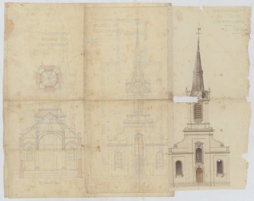 Opschrift: Agrandissement de l'église d'Herffelinghen. Omschrijving plan: opstand voorgevel, plattegrond, langsdoorsnede, dwarsdoorsnede (deel 4) Datum KCML: deze informatie wordt niet vermeld op het archiefstuk Archiefnummer: B0385_d
