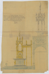 Opschrift: Parochiale kerk van Sint-Martinus te Halle. Ontwerp van een nieuw hoogaltaar (met verplaatsen van het albasten altaarschrijn en deszelfs herstelling). Omschrijving plan: voor- en zijaanzicht altaar Datum KCML: 24/07/1909 Archiefnummer: B0313