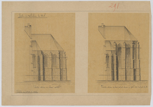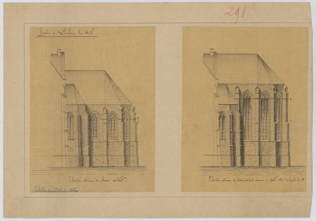 Opschrift: Eglise de Lembecq-lez-Hal. Omschrijving plan: opstand achtergevel, koor Datum KCML: deze informatie wordt niet vermeld op het archiefstuk Archiefnummer: B0362