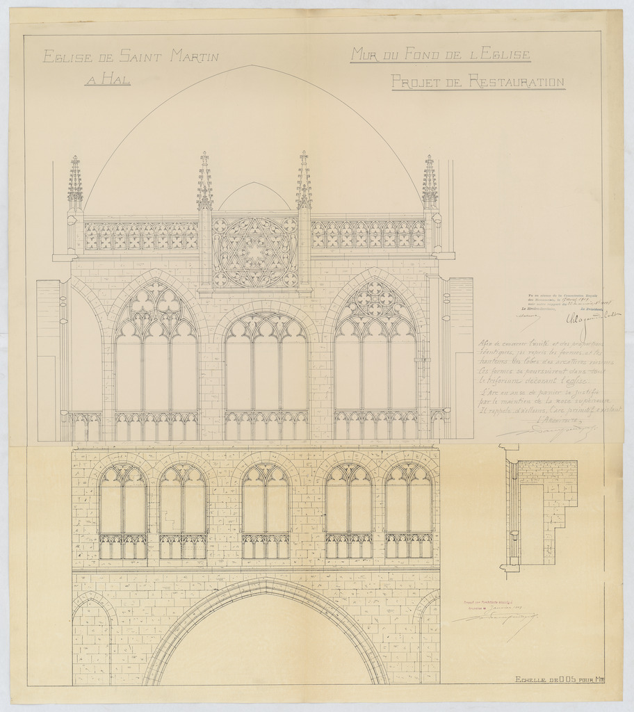 Opschrift: Eglise de Saint Martin à Hal. Mur du fond de l'église. Projet de restauration. Omschrijving plan: opstand muur (aangepast ontwerp) Datum KCML: 17/04/1909 Archiefnummer: B0309_01