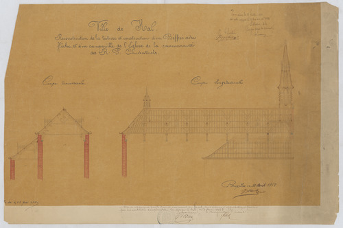 Opschrift: Ville de Hal. Reconstruction de la toiture et construction d'un Beffroi avec flêche, et d'un campanille de l'Eglise de la communauté des R.P. Conventuels. Omschrijving plan: dwarsdoorsnede, langsdoorsnede Datum KCML: 25/07/1868 Archiefnummer: B0320