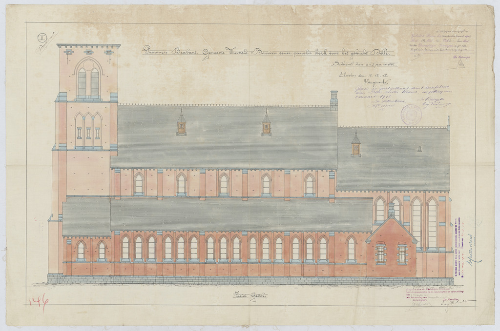 Opschrift: Provincie Brabant.Gemeente Winxele. Bouwen eener parochie kerk voor het gehucht Delle. Omschrijving plan: opstand Z-gevel Datum KCML: 2-8-1913 Archiefnummer: B0382
