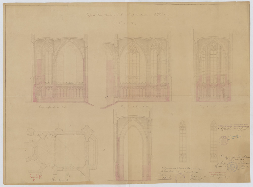 Opschrift: Eglise de Saint Martin à Hal. Projet de restauration. Chapelle de la Vierge. Omschrijving plan: plattegrond niveau 0, plattegrond, aanzicht en doorsnede kapel Datum KCML: deze informatie wordt niet vermeld op het archiefstuk Archiefnummer: B0308