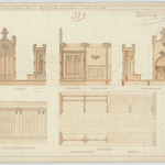 Opschrift: Eglise paroissiale de Saint Martin à Hal. Projet de stalles pour le choeur. Omschrijving plan: plattegrond, voor-, zij- en achteraanzicht en doorsnede gestoelte Datum KCML: 23/05/1896 Archiefnummer: B0303