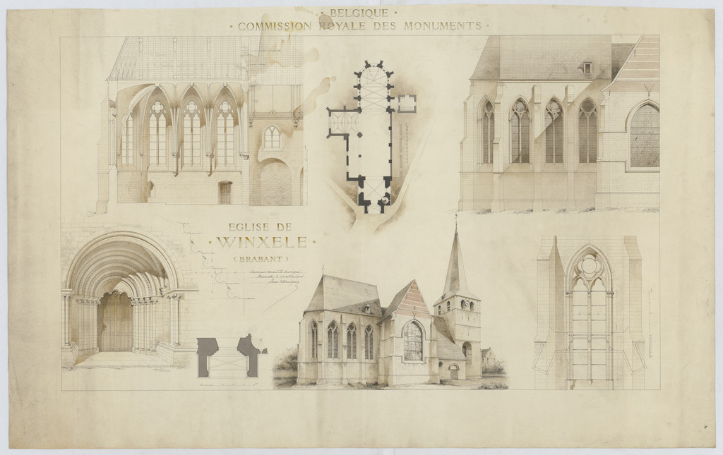 Opschrift: Eglise de Winxele (Brabant). Omschrijving plan: plattegrond niveau 0, opstand zijgevel, koor, langsdoorsnede, details Datum KCML: deze informatie wordt niet vermeld op het archiefstuk Archiefnummer: B0376