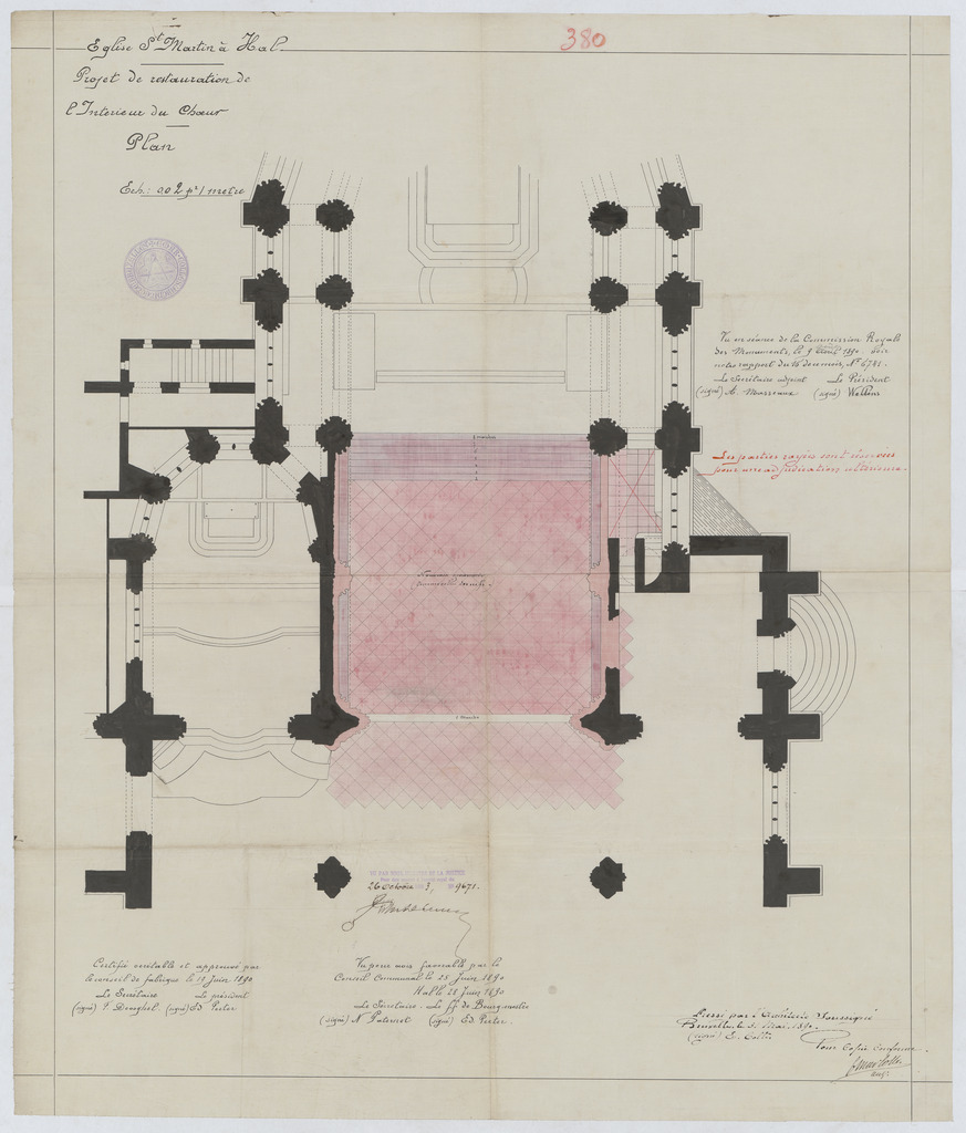 Opschrift: Eglise St. Martin à Hal. Projet de restauration de l'Interieur du Choeur. Omschrijving plan: plattegrond niveau 0, plattegrond koor Datum KCML: 09/08/1890 Archiefnummer: B0300
