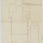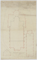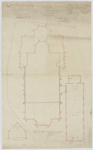 Opschrift: Campenhout. Emplacement de L'église actuelle, de cette projetée et de celle provisoire. Omschrijving plan: plattegrond niveau 0 Datum KCML: deze informatie wordt niet vermeld op het archiefstuk Archiefnummer: B0428
