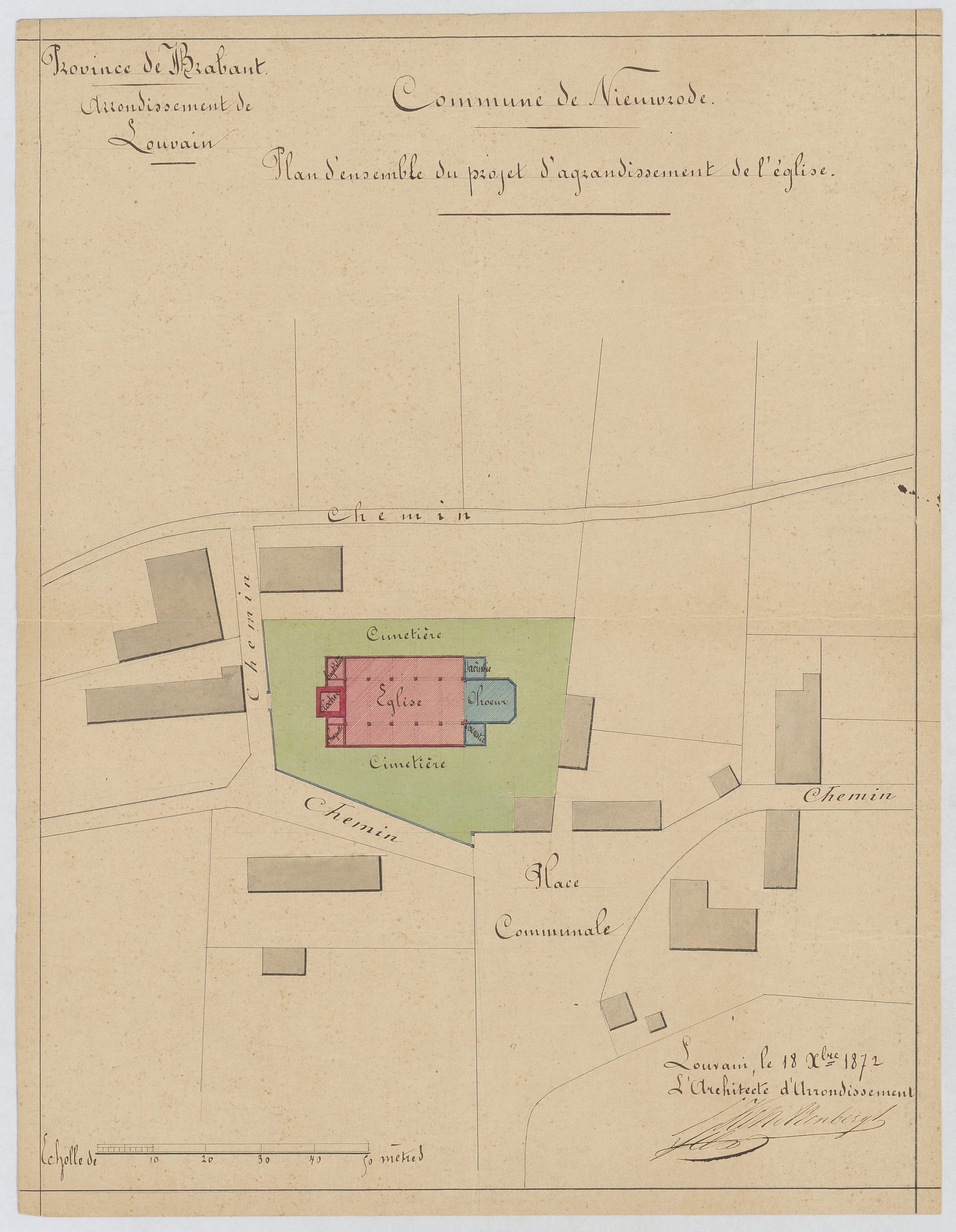 Opschrift: Commune de Nieuwrode. Plan d'ensemble du projet d'agrandissement de l'église. Omschrijving plan: situatieplan Datum KCML: deze informatie wordt niet vermeld op het archiefstuk Archiefnummer: B0415 Ontwerper: Van Arenbergh, voornaam onbekend