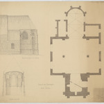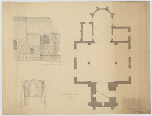 Opschrift: Eglise de Crainhem. Etat actuel Omschrijving plan: plattegrond niveau 0, plattegrond, opstand en doorsnede koor Datum KCML: deze informatie wordt niet vermeld op het archiefstuk Archiefnummer: B0486