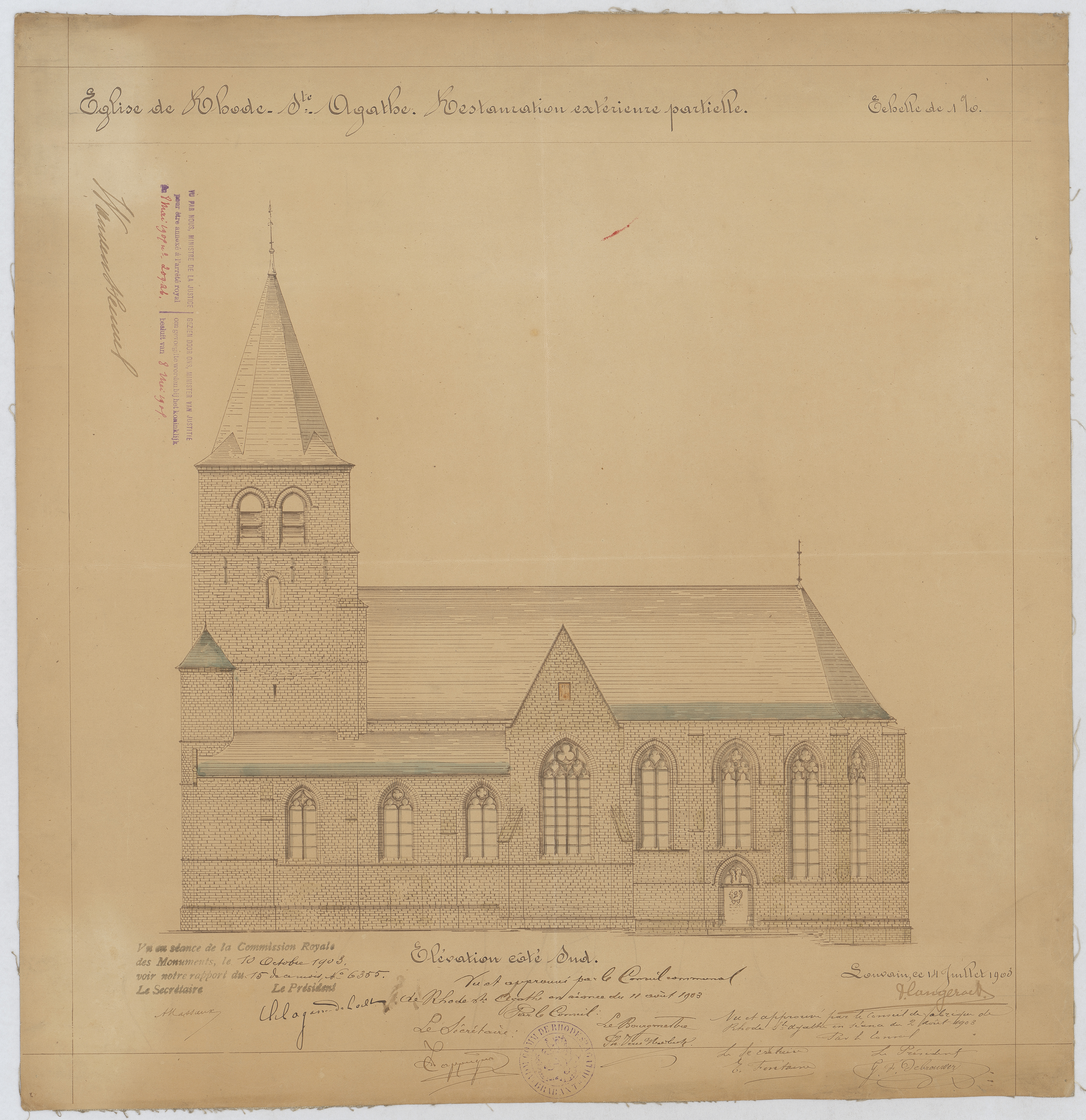 Opschrift: Eglise de Rhode-Ste.-Agathe. Restauration extérieure partielle. Omschrijving plan: opstand Z-gevel Datum KCML: 10/10/1903 Archiefnummer: B0426