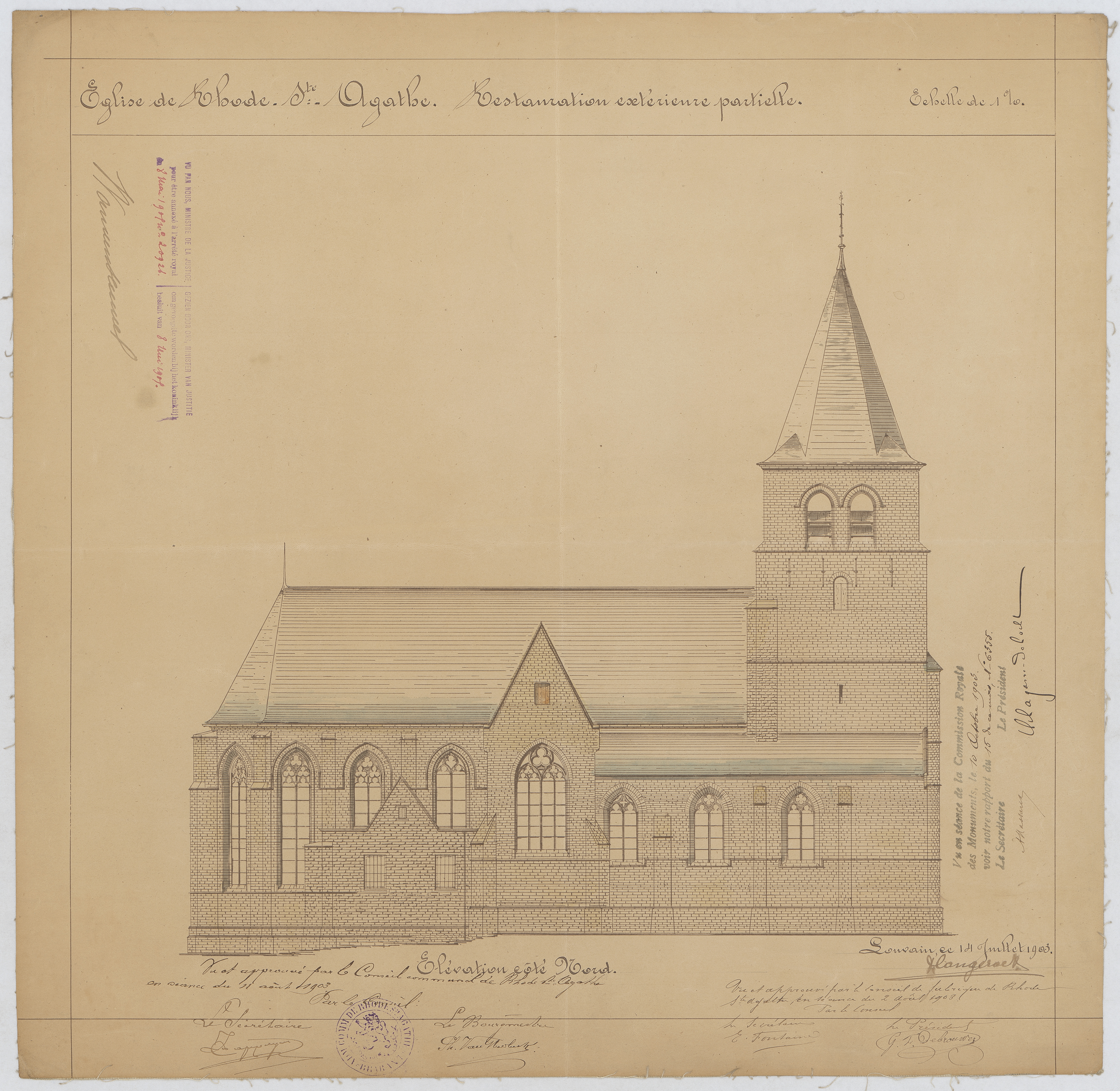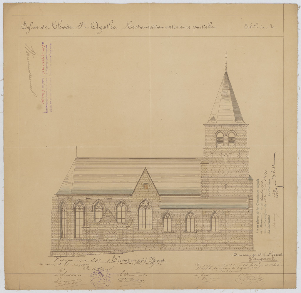 Opschrift: Eglise de Rhode-Ste.-Agathe. Restauration extérieure partielle. Omschrijving plan: opstand N-gevel Datum KCML: 10/10/1903 Archiefnummer: B0427