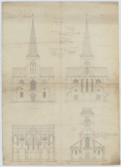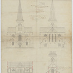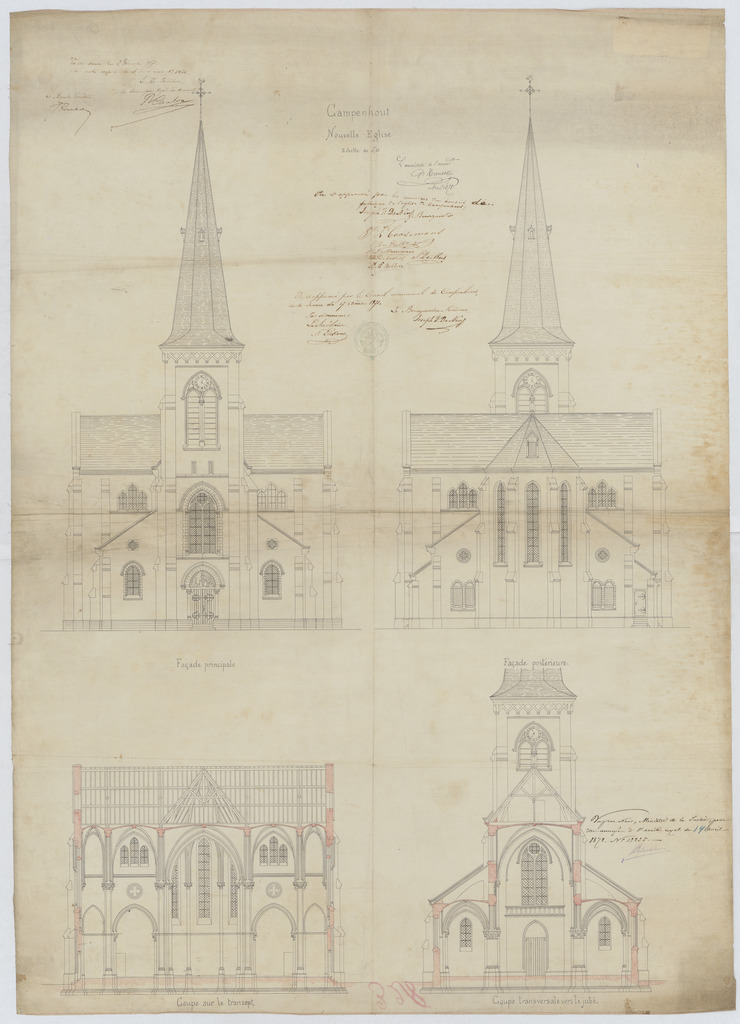 Opschrift: Campenhout. Nouvelle église. Omschrijving plan: opstand voorgevel, opstand achtergevel, dwarsdoorsnede naar koor, dwarsdoorsnede naar portaal Datum KCML: deze informatie wordt niet vermeld op het archiefstuk Archiefnummer: B0429