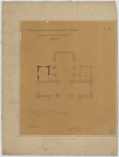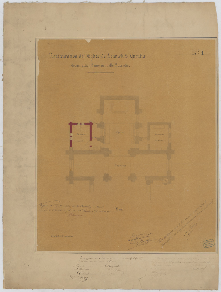 Opschrift: Restauration de l'Eglise de Lennick St. Quentin et construction d'une nouvelle sacristie. Omschrijving plan: plattegrond niveau 0 Datum KCML: deze informatie wordt niet vermeld op het archiefstuk Archiefnummer: B0497