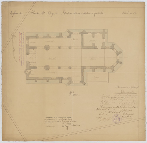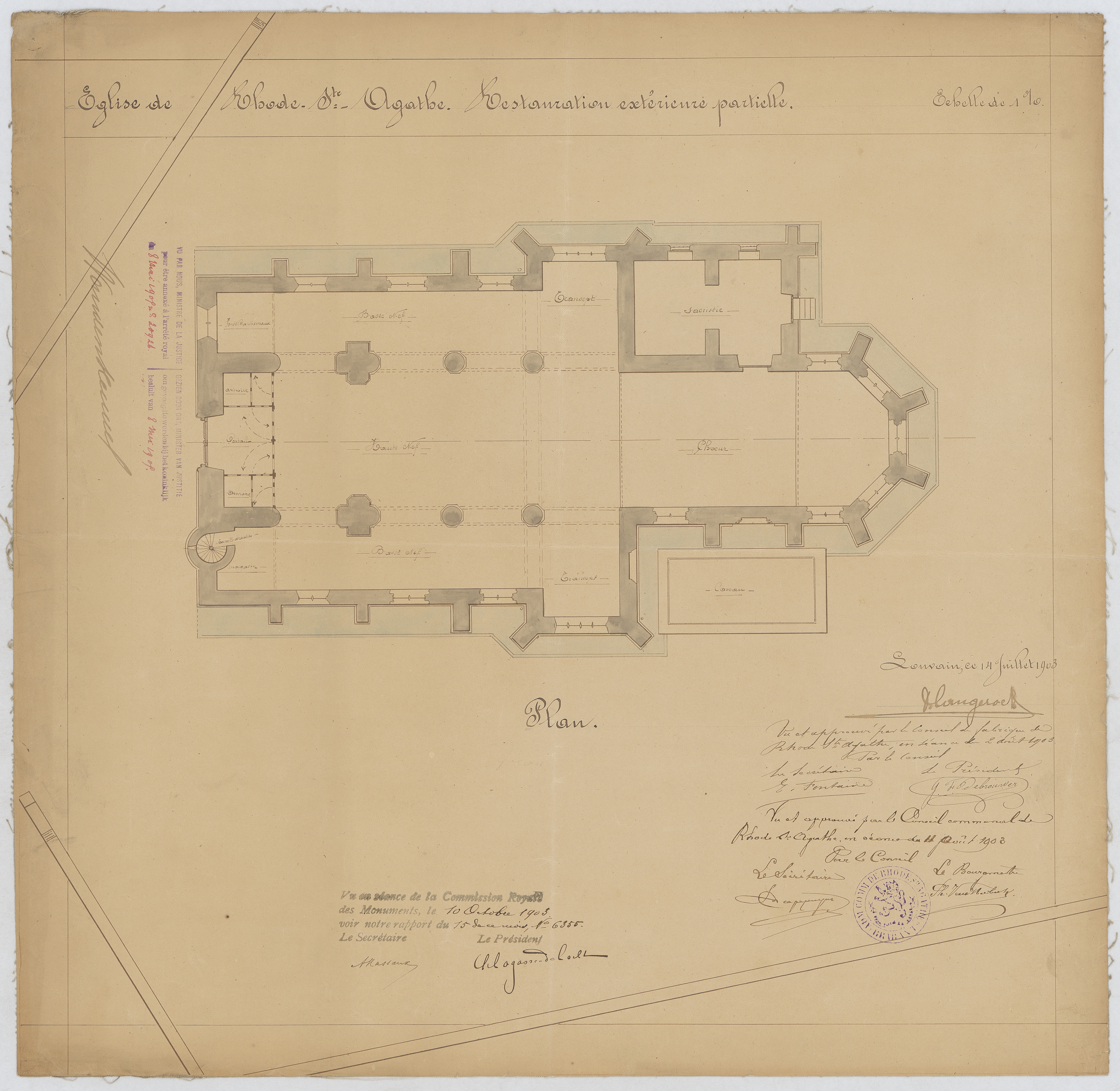 Opschrift: Eglise de Rhode-Ste.-Agathe. Restauration extérieure partielle. Omschrijving plan: plattegrond niveau 0 Datum KCML: 10/10/1903 Archiefnummer: B0424