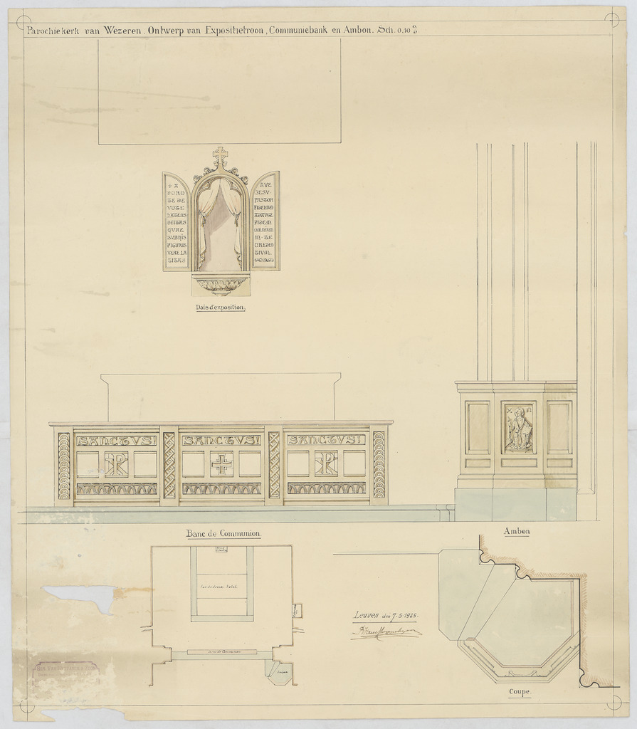 Opschrift: Parochiekerk van Wezeren. Ontwerp van Expositietroon, Communiebank en Ambon Omschrijving plan: plattegrond en aanzicht communiebank, preekstoel en expositietroon Datum KCML: deze informatie wordt niet vermeld op het archiefstuk Archiefnummer: B0491