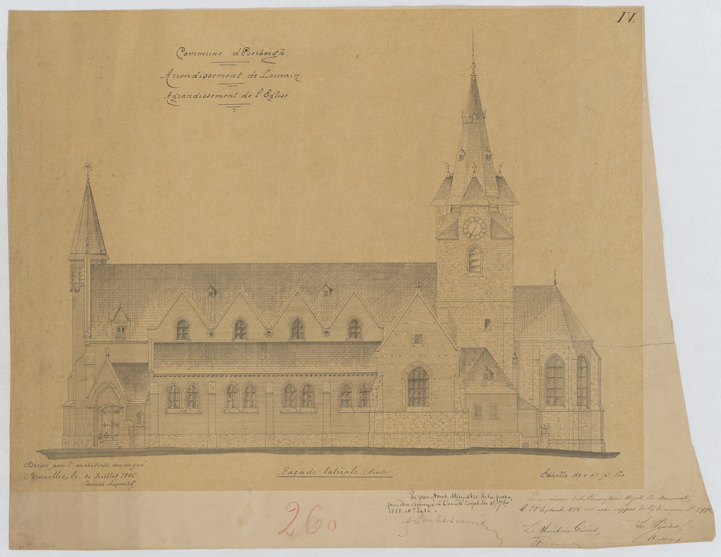 Opschrift: Commune d'Everbergh. Arrondissement de Louvain. Agrandissement de l'Eglise. Omschrijving plan: opstand zijgevel 1 Datum KCML: 25/09/1886 Archiefnummer: B0472