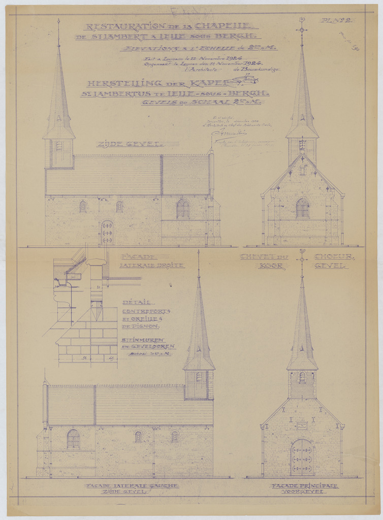 Opschrift: Herstelling der kapel van St.-Lambertus te Lelle sous Bergh. Omschrijving plan: opstand voorgevel, opstand achtergevel, opstand zijgevel 1, opstand zijgevel 2 Datum KCML: deze informatie wordt niet vermeld op het archiefstuk Archiefnummer: B0432
