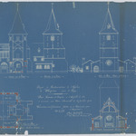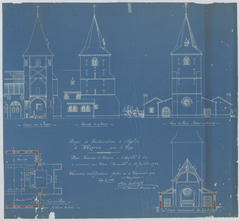 Opschrift: Projet de Restauration de l'Eglise de Wezeren, prov. de Liège. Omschrijving plan: plattegrond niveau 0, opstand voorgevel, opstand zijgevel, dwarsdoorsnede, doorsnede toren Datum KCML: deze informatie wordt niet vermeld op het archiefstuk Archiefnummer: B0494