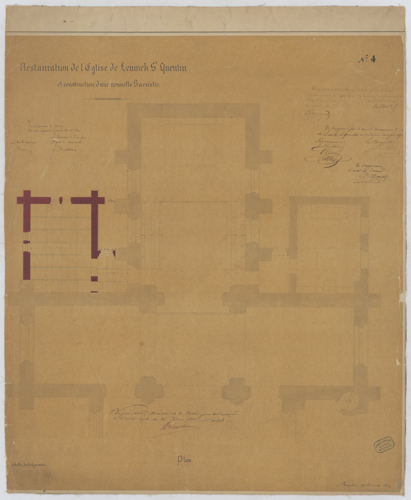 Opschrift: Restauration de l'Eglise de Lennick St. Quentin et construction d'une nouvelle sacristie. Omschrijving plan: plattegrond niveau 0 Datum KCML: deze informatie wordt niet vermeld op het archiefstuk Archiefnummer: B0498
