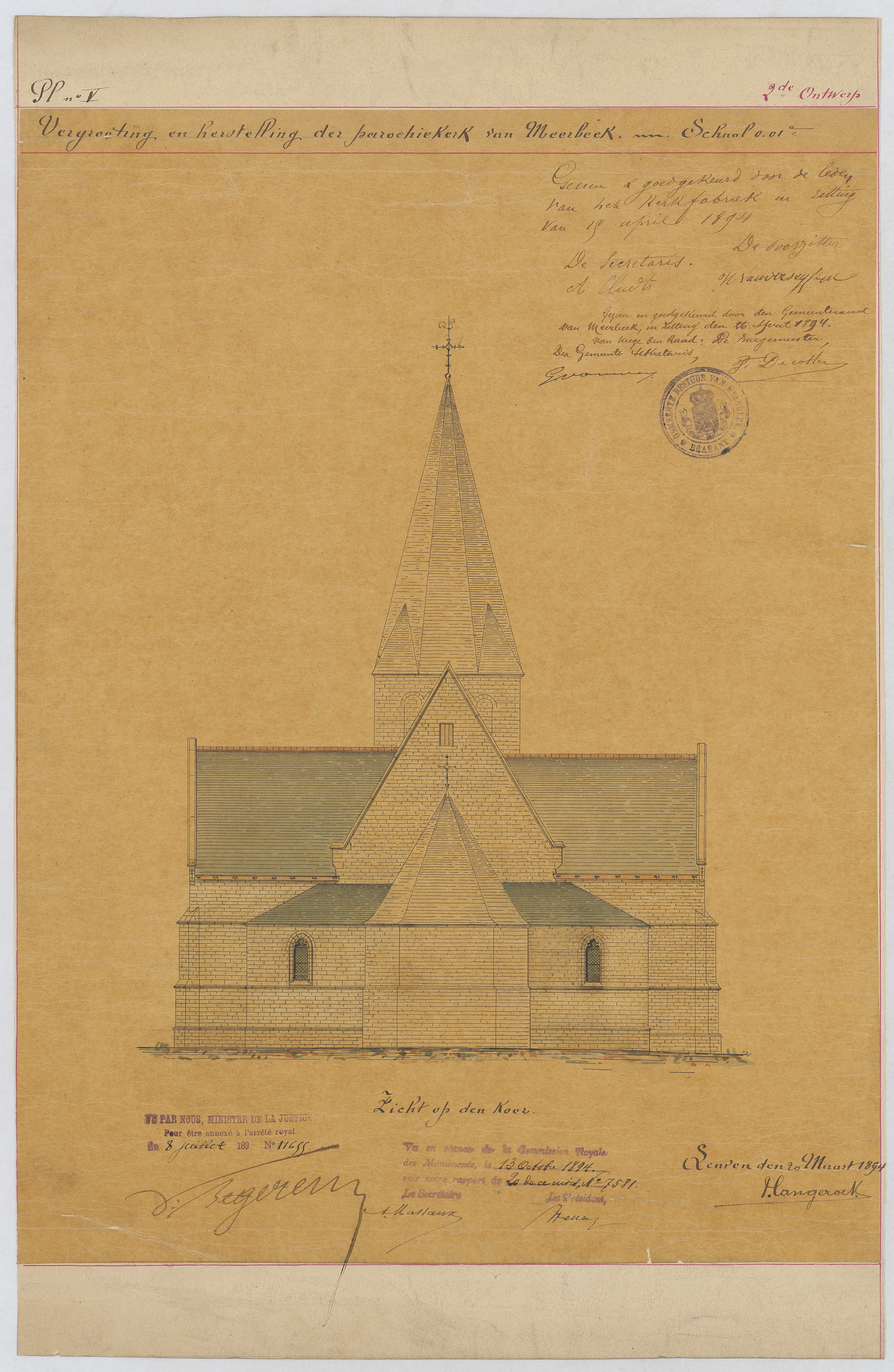 Opschrift: Vergrooting en herstelling der parochiekerk van Meerbeek. Omschrijving plan: opstand O-gevel Datum KCML: 13/10/1894 Archiefnummer: B0481