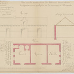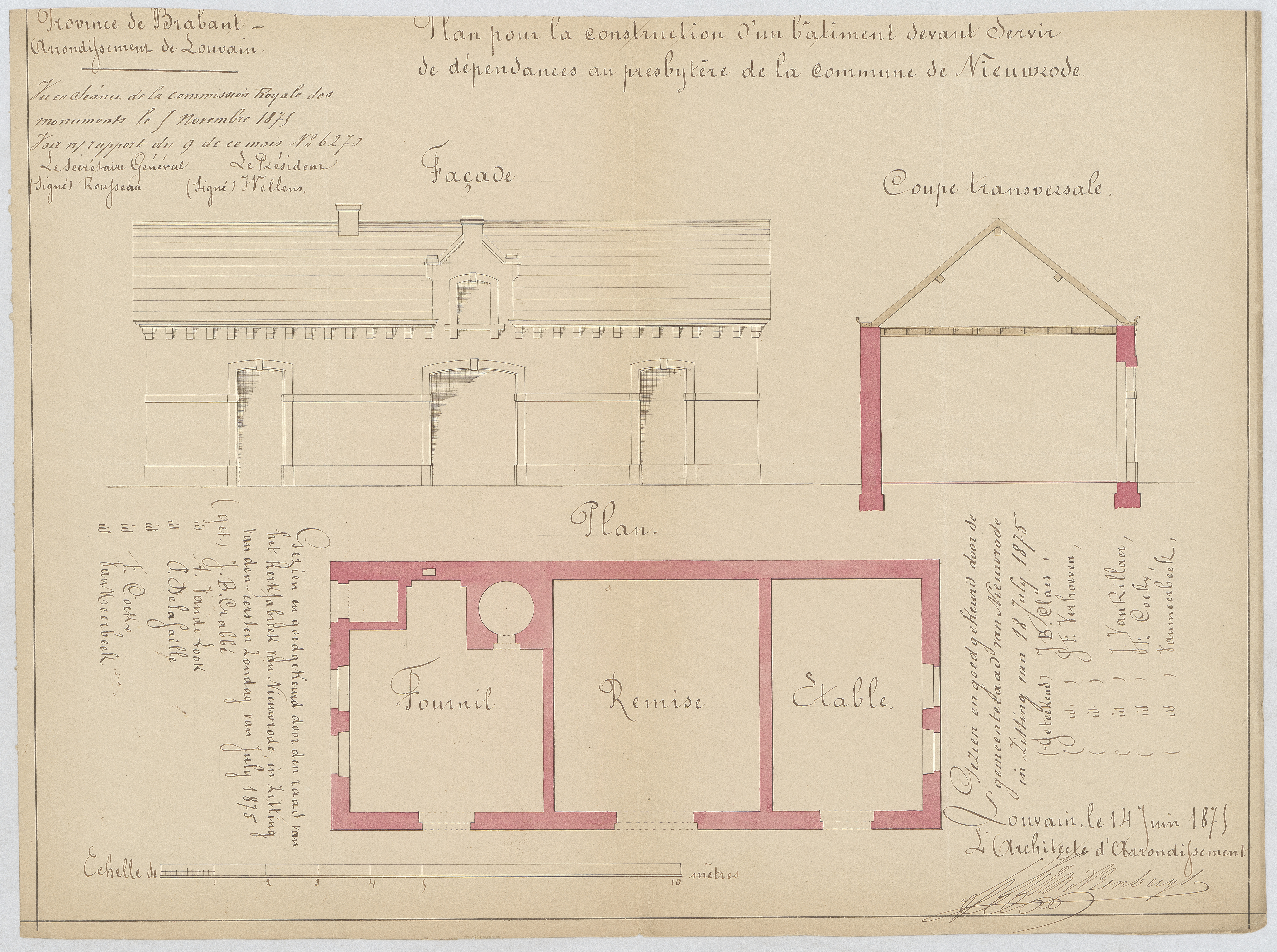 Opschrift: Plan pour la construction d'un bâtiment devant Servir de dépendances au presbytère de la commune de Nieuwrode. Omschrijving plan: plattegrond niveau 0, opstand voorgevel, dwarsdoorsnede Datum KCML: 07/11/1875 Archiefnummer: B0420 Ontwerper: Van Arenbergh, voornaam onbekend