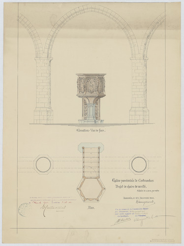 Opschrift: Eglise paroissiale de Cortenaeken. Projet de chaire de verité. Omschrijving plan: plattegrond en aanzicht preekstoel Datum KCML: 29/07/1911 Archiefnummer: B0458