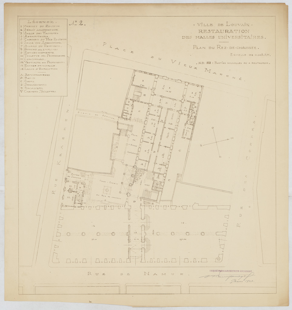 Opschrift: Ville de Louvain. Restauration des halles universitaires. Plan du rez-de-chaussée. Omschrijving plan: plattegrond niveau 0 Datum KCML: deze informatie wordt niet vermeld op het archiefstuk Archiefnummer: B0580