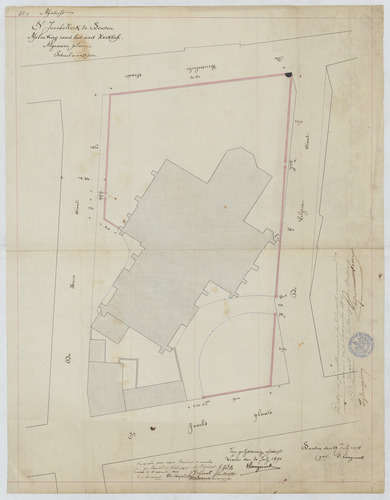 Opschrift: St. Jacobskerk te Leuven. Afsluiting rond het oud Kerkhof. Algemeen plan. Omschrijving plan: situatieplan Datum KCML: deze informatie wordt niet vermeld op het archiefstuk Archiefnummer: B0553