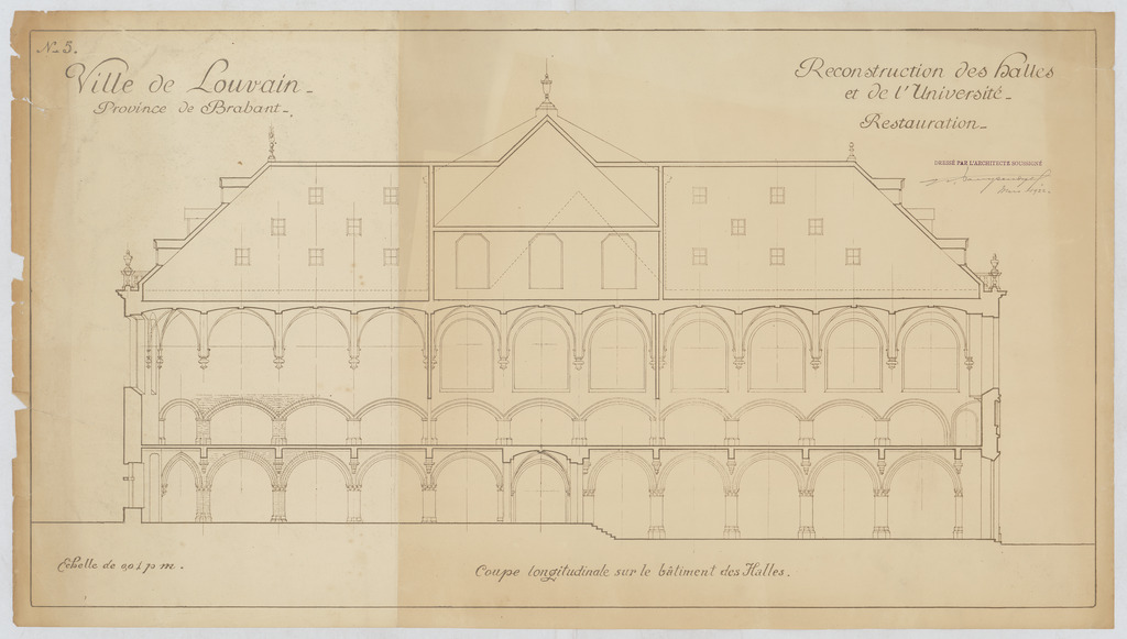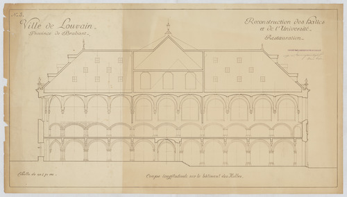 Opschrift: Ville de Louvain. Province de Brabant. Reconstruction des halles et de l'Université. Restauration. Omschrijving plan: langsdoorsnede Datum KCML: deze informatie wordt niet vermeld op het archiefstuk Archiefnummer: B0583
