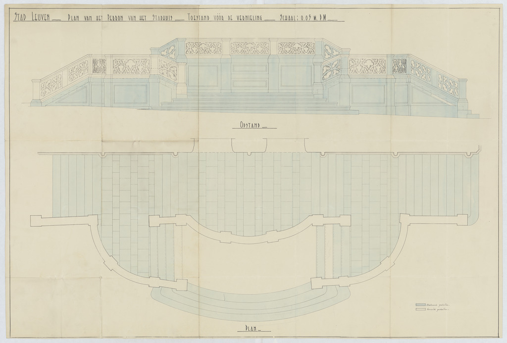 Opschrift: Stad Leuven. Plan van het perron van het stadhuis. Toestand voor de vernieling. Omschrijving plan: plattegrond en aanzicht perron stadhuis Datum KCML: deze informatie wordt niet vermeld op het archiefstuk Archiefnummer: B0574