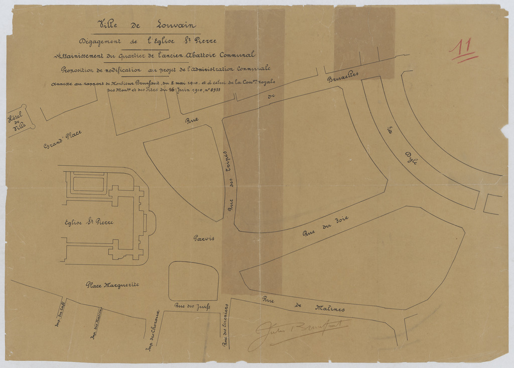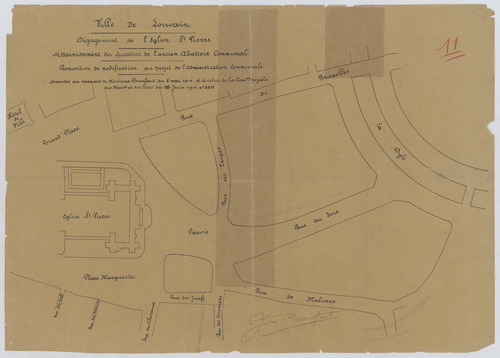 Opschrift: Ville de Louvain. Dégagement de l'église St. Pierre. Assainissement du quartier de l'ancien abattoir communal. Proposition de modification au projet de l'administration communale. Omschrijving plan: situatieplan Datum KCML: 16/06/1910 Archiefnummer: B0511